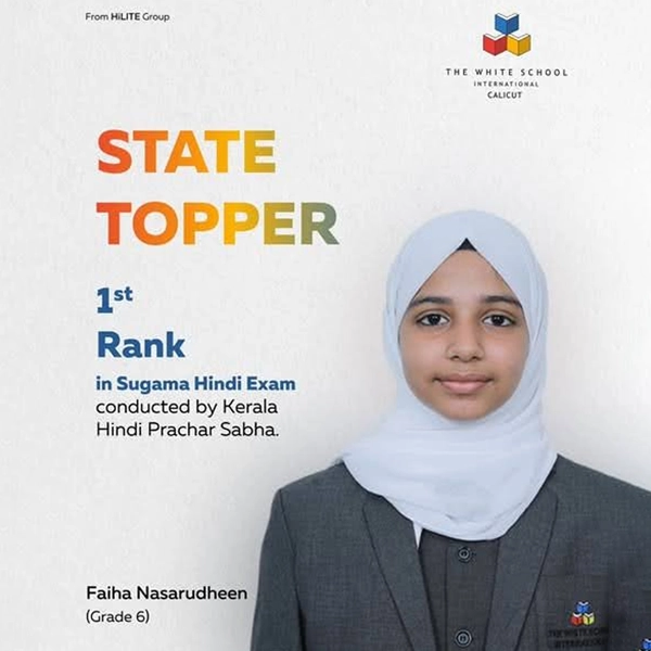 State Topper Announcement! Congratulations to Faiha Nasarudheen (Grade 6) from The White School International (TWSI) for achieving 1st Rank in the Sugama Hindi Exam conducted by the Kerala Hindi Prachar Sabha